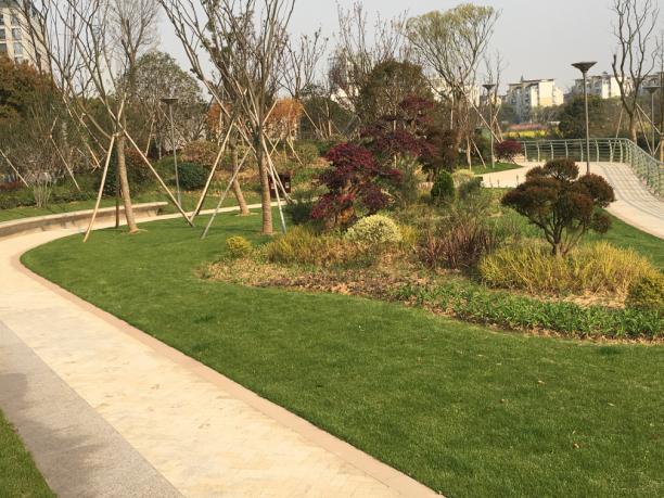 綠化則堆土成坡,緩急錯(cuò)落,成片成林種植開花或觀葉植物。冬可賞紅梅朵朵暗香輕襲,春有櫻花林落英繽紛如沐花雨,夏可至荷風(fēng)四面觀芙蓉出水妖妖灼灼,秋則可賞丹桂若云楓紅似火。背景林以中尺度常規(guī)常綠喬木形成屏障,大尺度和中尺度落葉喬木片植或點(diǎn)植,滿足秋冬兩季的觀賞需求?;顒?dòng)空間沿路片植或點(diǎn)植開花類喬木,提高整個(gè)空間的色彩視覺效果,增加植栽綠化對人群的趣味性。球類灌木以無刺、耐修剪品種為主,種植于園路路口、沿路落葉喬木下,增加整個(gè)綠化空間的近距離觀感。